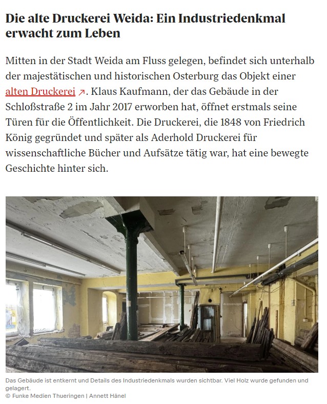 Mitten in der Stadt Weida und am Fluss Weida gelegen, befindet sich unterhalb der majestätischen und historischen Osterburg das Objekt einer alten Druckerei, welches aus zwei Flurstücken besteht und erst wieder als eine Einheit zusammengeführt wurde. Das Objekt mit interessanter Geschichte und interessanter 4-Seiten-Architektur mit Innenhof und Hofzufahrt findet sich immer wieder auf alten und neuen Postkarten, in Tourismus-Broschüren, als Cover von Straßenkarten oder in Wanderbüchern. Die Stadt Gera befindet sich nur ca. 15 Autominuten entfernt, so dass die Stadt Weida im Einzugsgebiet und Speckgürtel von Gera liegt und interessante Möglichkeiten bietet. Auch die attraktive Stadt Greiz (genannt als Perle des Vogtlandes) sowie das Naherholungsgebiet um die Talsperre Zeulenroda liegt nur jeweils etwa 15 Autominuten entfernt.
